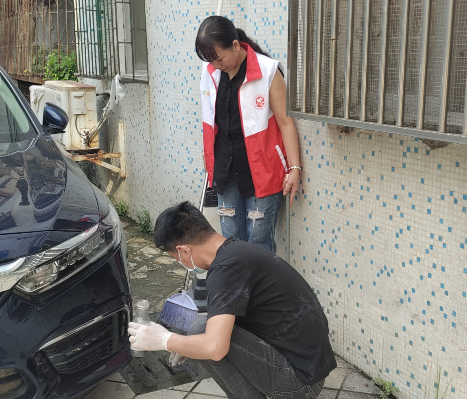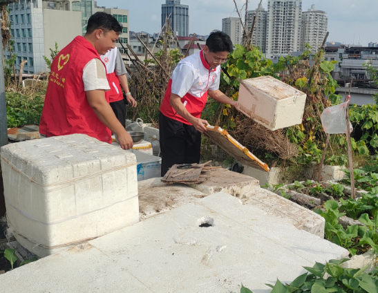 活动现场,工作人员分工明确、默契配合,手持扫帚、夹子、垃圾袋等工具,对公共区域的落叶、烟头、白色垃圾进行全面清扫,重点清理墙角缝隙、绿化带死角等易积存垃圾的区域。同时,工作人员还围绕蚊虫孳生核心源头开展治理,逐户排查小区花盆托盘、闲置水桶、废旧轮胎等易积水容器,通过翻盆倒罐、擦拭内壁等方式彻底清空积水,消除蚊虫产卵温床。针对下水道、排水沟等蚊虫孳生高发区域,专业人员严格按照操作规范,向沟渠内均匀投放灭蚴剂,并向居民发放防蚊手册,普及健康生活理念,引导居民主动参与环境维护。